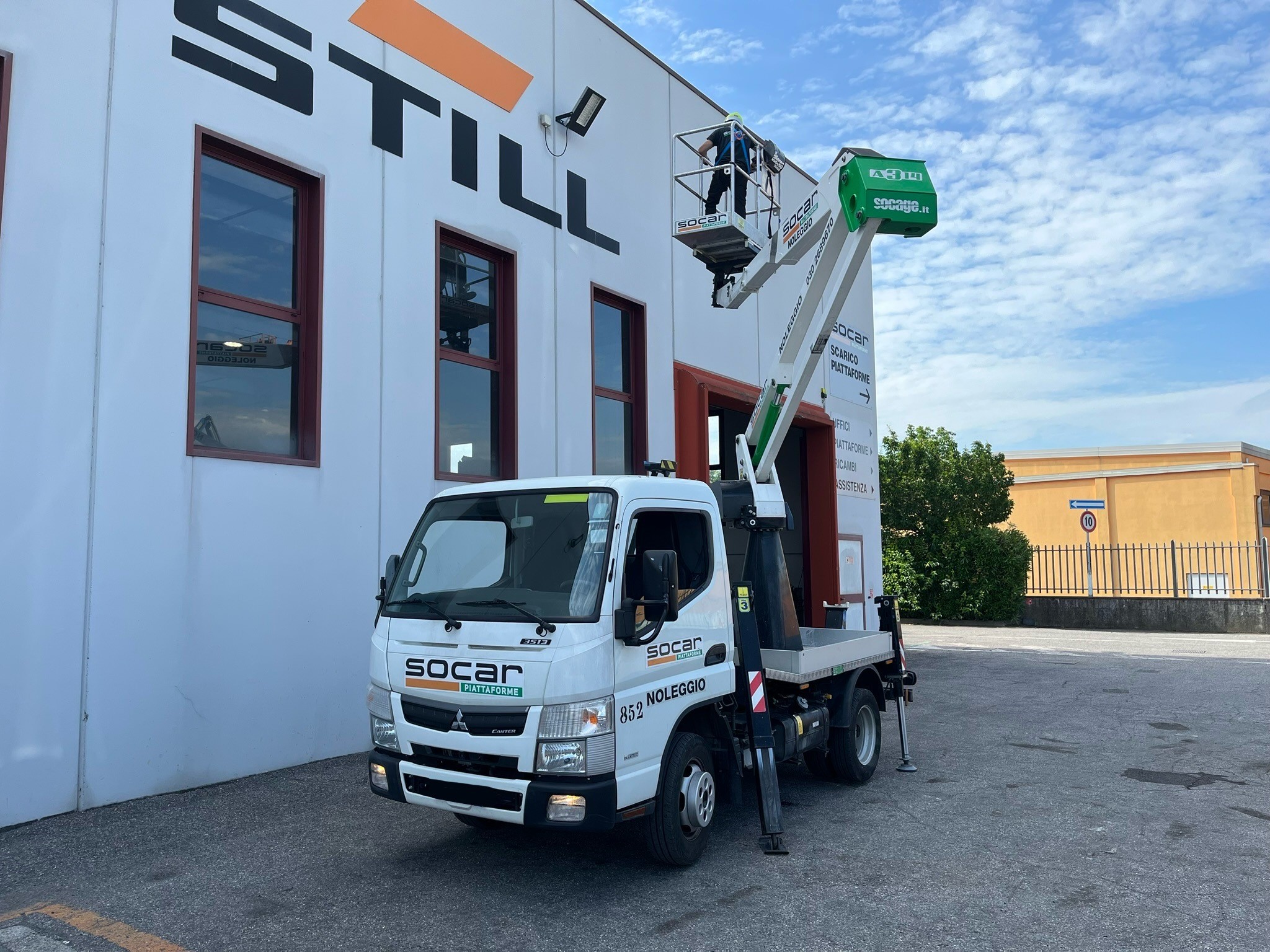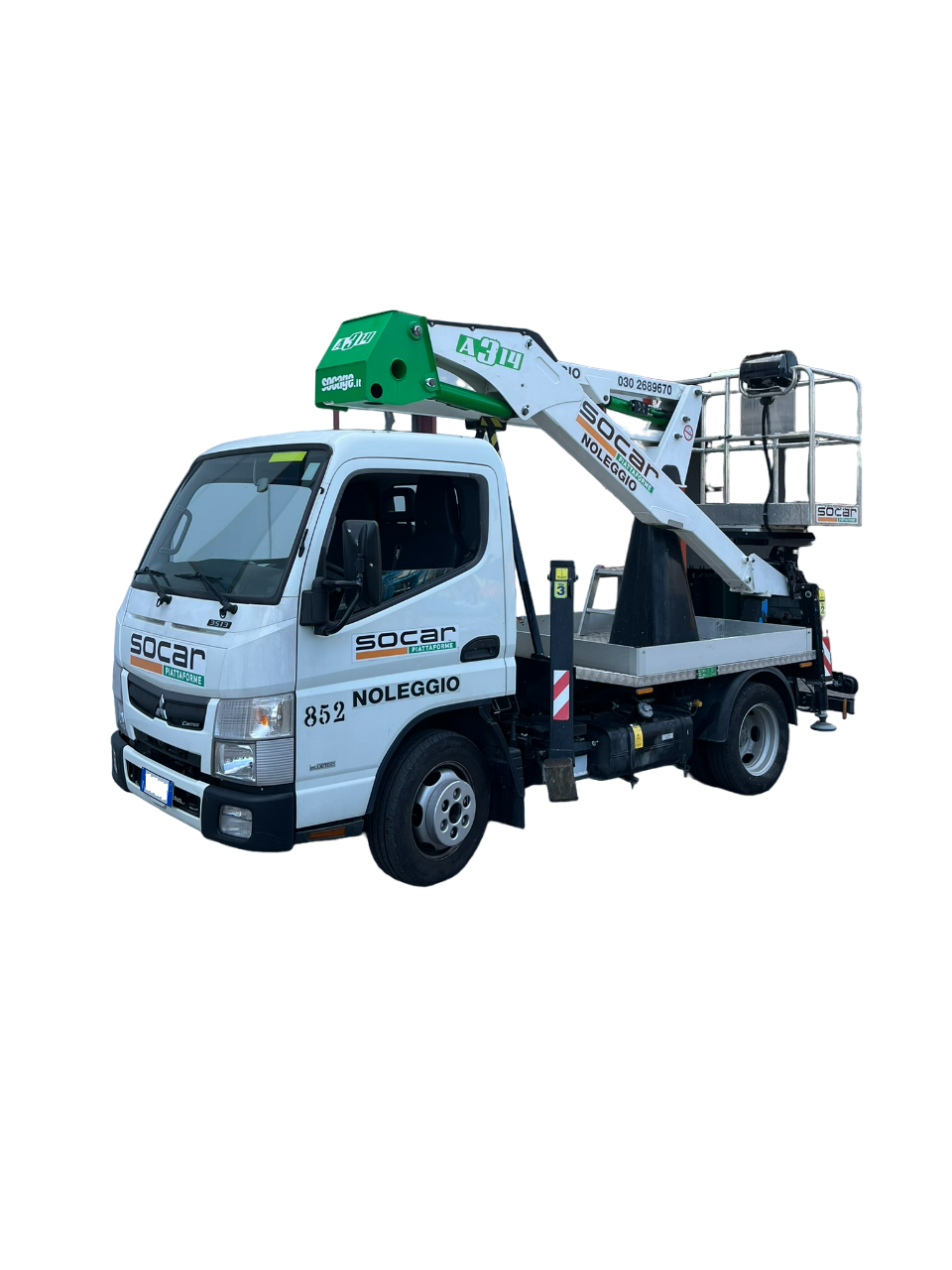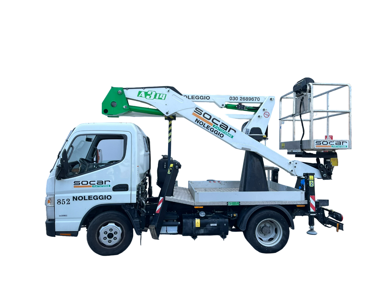 La SOCAGE camion con cestello compatto è in grado di raggiungere 13,70 m di altezza di lavoro e 7,10 m di portata laterale, con una capacità di carico nel cesto di 250 kg. (2 operatori + materiale).