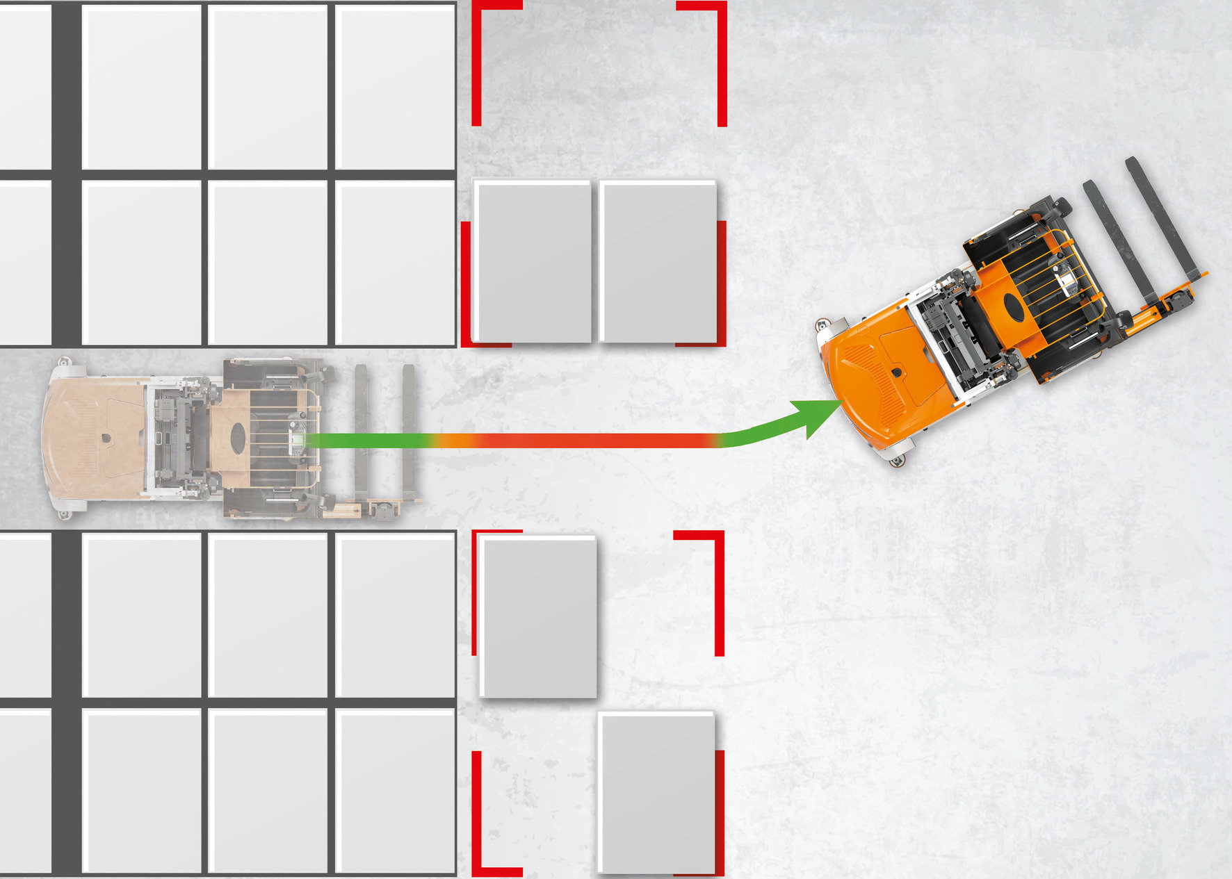 Orientamento smart: i carrelli elevatori che si muovono per guida induttiva forzata o per guida meccanica forzata sono in grado di riconoscere se si trovano nella corsia giusta del magazzino grazie al rilevamento di corsia senza contatto.