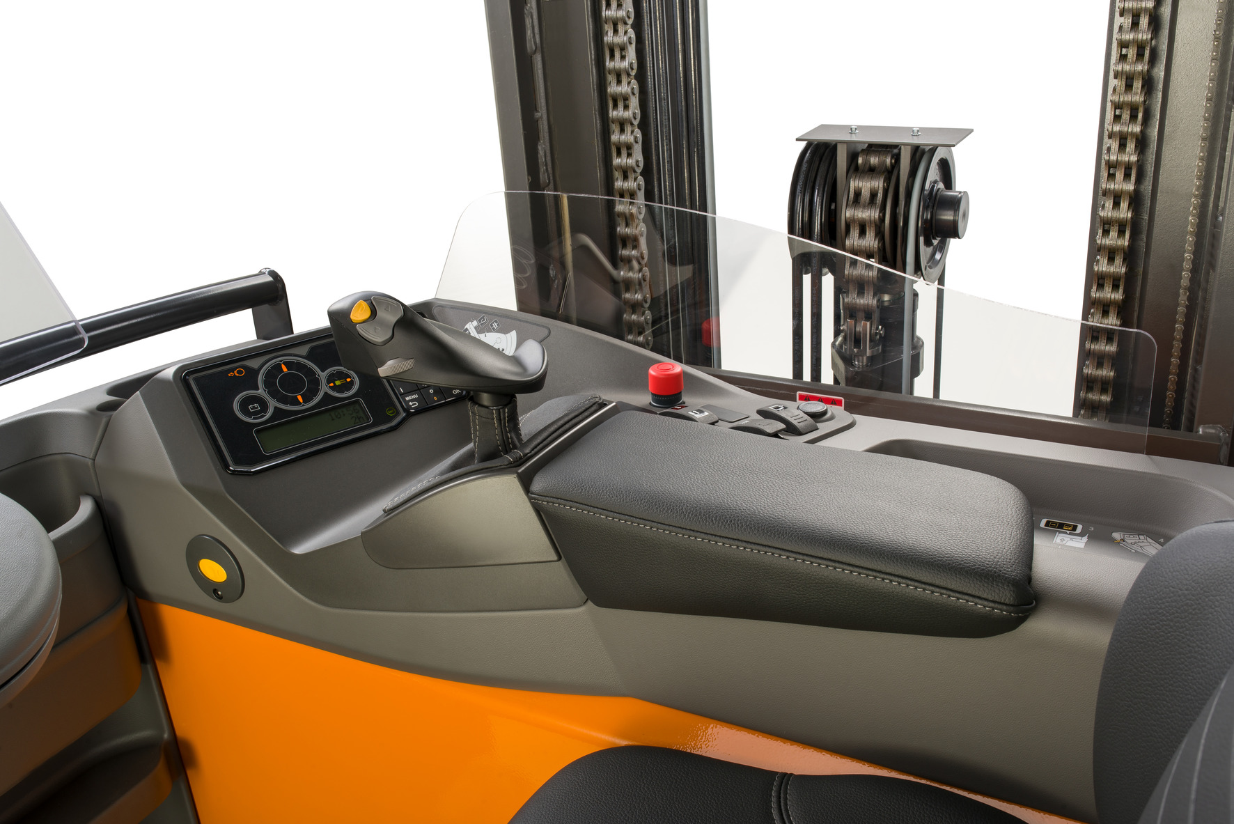 Altri vantaggi che rendono il lavoro più semplice sono il sistema di pre-selezione dell’altezza di sollevamento e il sistema di assistenza dell’altezza di sollevamento. I sistemi opzionali facilitano notevolmente il deposito e prelievo veloce e preciso del materiale. Il sedile, i braccioli, lo sterzo e la pedana poggiapiedi possono essere regolate per aumentare la facilità di utilizzo. Un’ampia gamma di impostazioni permettono l’adeguamento della cabina alle esigenze di qualsiasi guidatore, assicurando un’ergonomia ottimizzata.