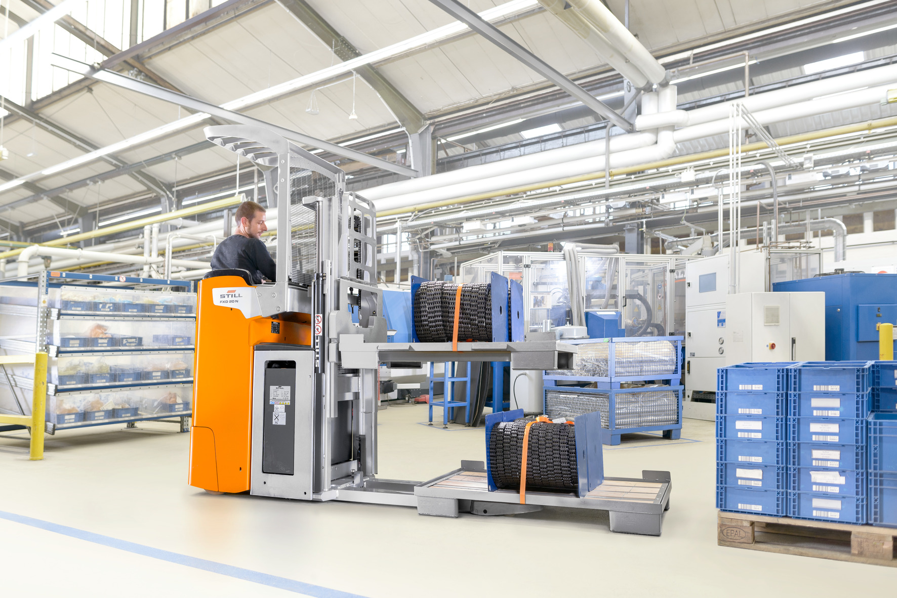 Velocità di movimentazione e comfort: ecco cosa offre il doppio stoccatore FXD 20. Può trasportare due pallet non impilabili allo stesso tempo. La portata massima fino a 2.000 kg abbinata alla velocità max. di 12 km/h assicura prestazioni eccezionali. Con l’altezza del montante superiore a 2,3 m e una portata max. di 1.200 kg sul montante, l’FXD 20 è tanto versatile quanto potente. I suoi punti di forza risiedono nel funzionamento multi-turno, visto che grazie alla sostituzione della batteria laterale e alle capacità di batteria fino a 625 Ah l’FXD 20 è disponibile 24 ore su 24. Opzionalmente la tecnologia agli ioni di litio consente la ricarica intermedia rapida senza togliere la batteria. I pedali opzionali permettono la manovrabilità precisa nei corridoi. Le funzioni di sollevamento sono attivate tramite Joystick 4Plus. Grazie al design ergonomico del joystick il funzionamento senza sforzo è assicurato. Inoltre la riduzione automatica della velocità durante la guida in curva e l’adattamento della velocità in base all’altezza del montante garantiscono la massima sicurezza.