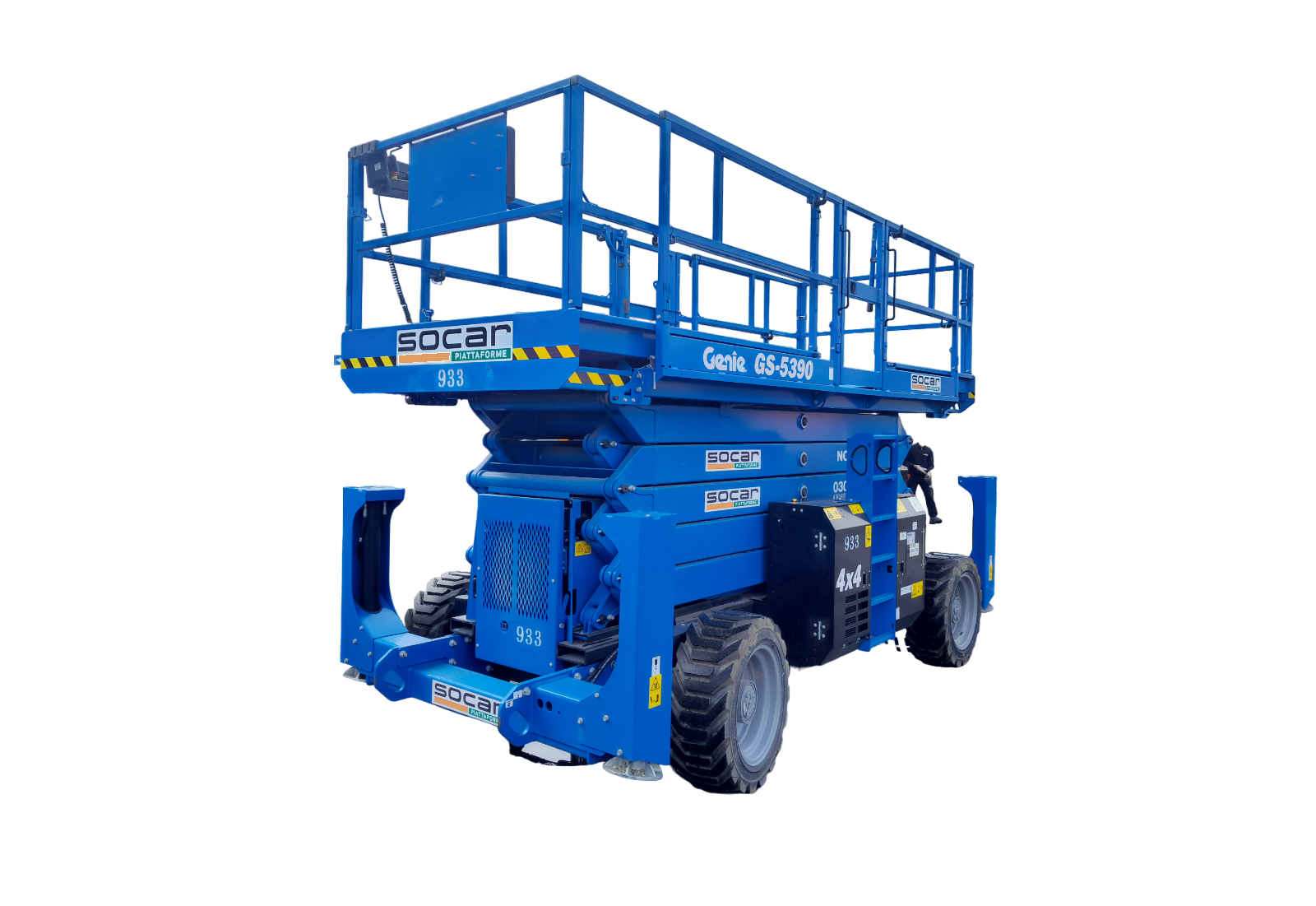 La piattaforma a forbice fuoristrada Genie GS-5390 è stata concepita per offrire prestazioni di robustezza eccellenti, con la capacità di spostarsi su terreni difficili e irregolari.