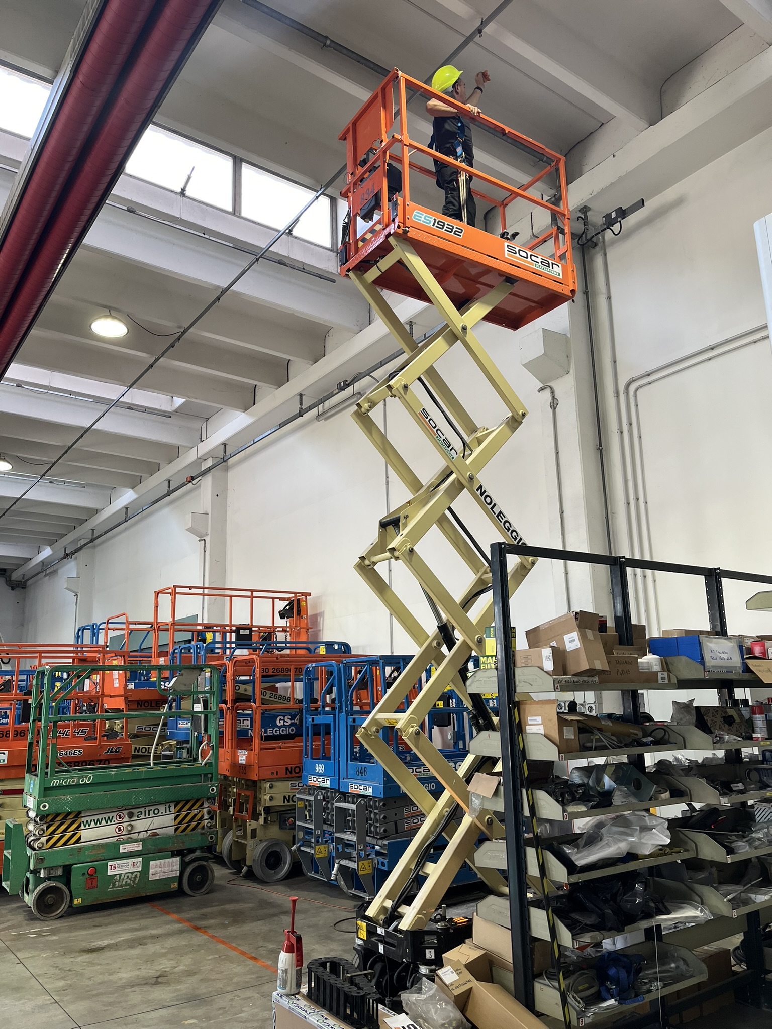 La piattaforma a forbice Genie GS-4046 E-Drive aumenta la produttività in ambienti con soffitti elevati.  Ideale per lavorare in corridoi…